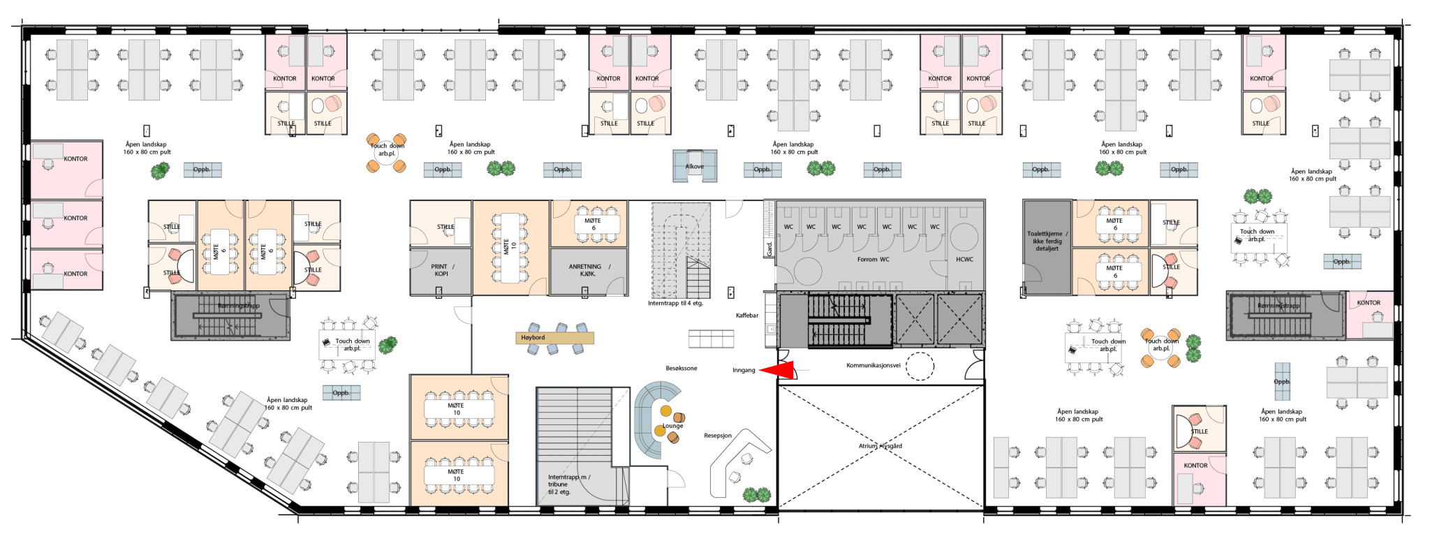 Lokalene vil skreddersys i samarbeid med nye leietakere. Eiendommen er allerede tilrettelagt med gode møterom, åpne oppholdssoner og kontorarealer av ulik størrelse. Se bilder fra eiendommen nedenfor.